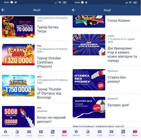 Повний перелік актуальних акцій можна дізнатися в розділі з такою ж назвою в додатку Андроїд. Також можна подивитися архів попередніх бонусів букмекера.