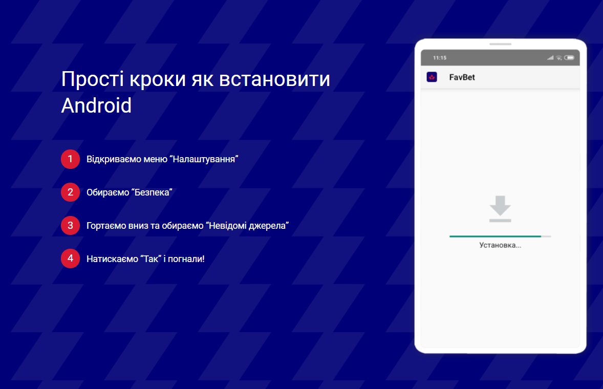 Favbet не має додатків для мобільних телефонів на базі IOS, тільки для пристроїв на базі операційної системи Android. Процес завантажування і встановлення додатку має наступний вигляд: